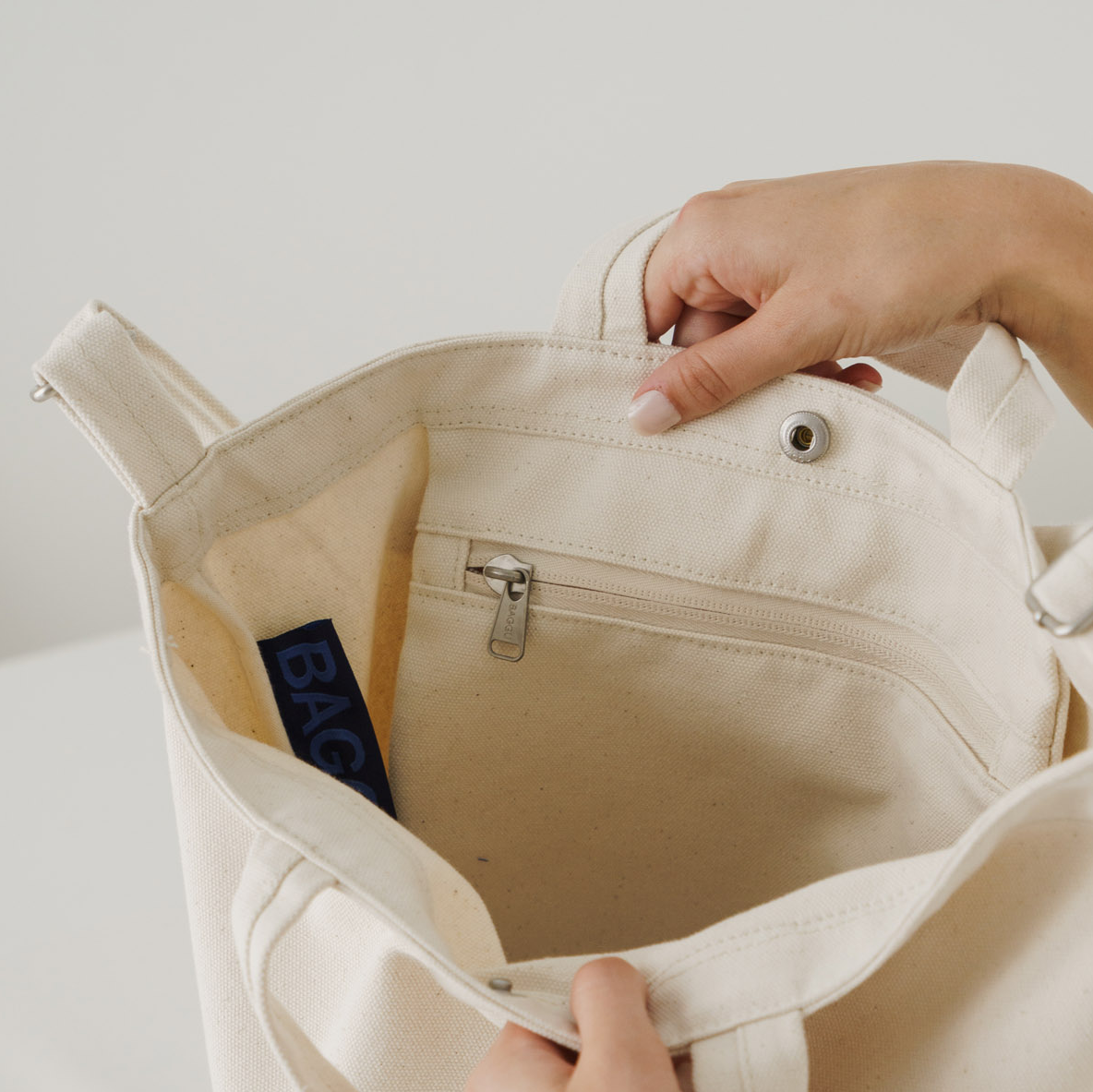 A Baggu Duck Bag with a snap top closure to keep your belongings nice and secure
